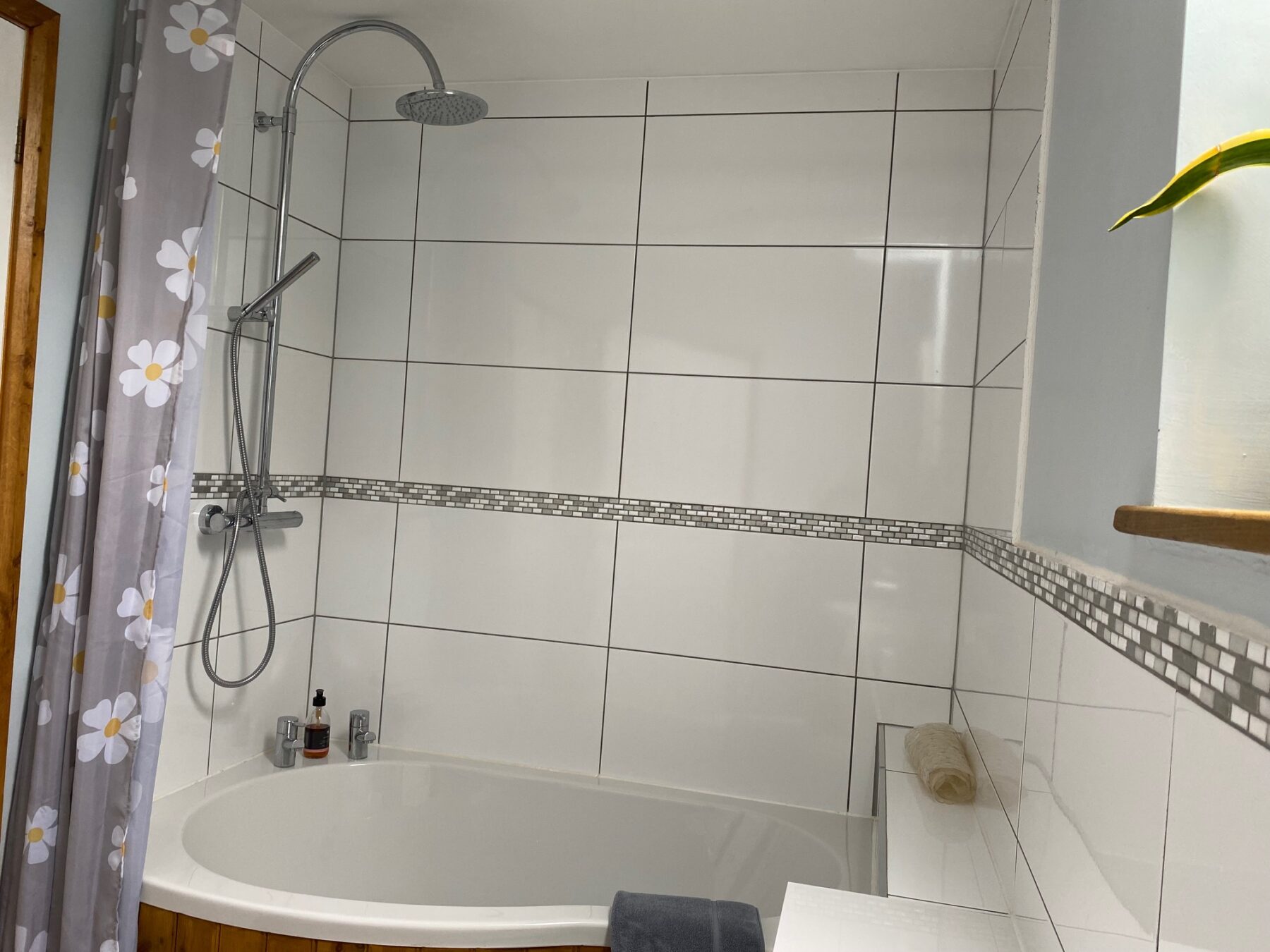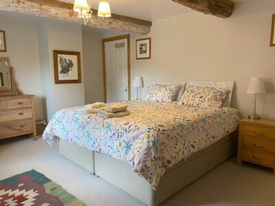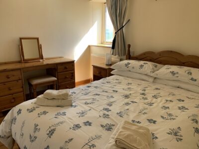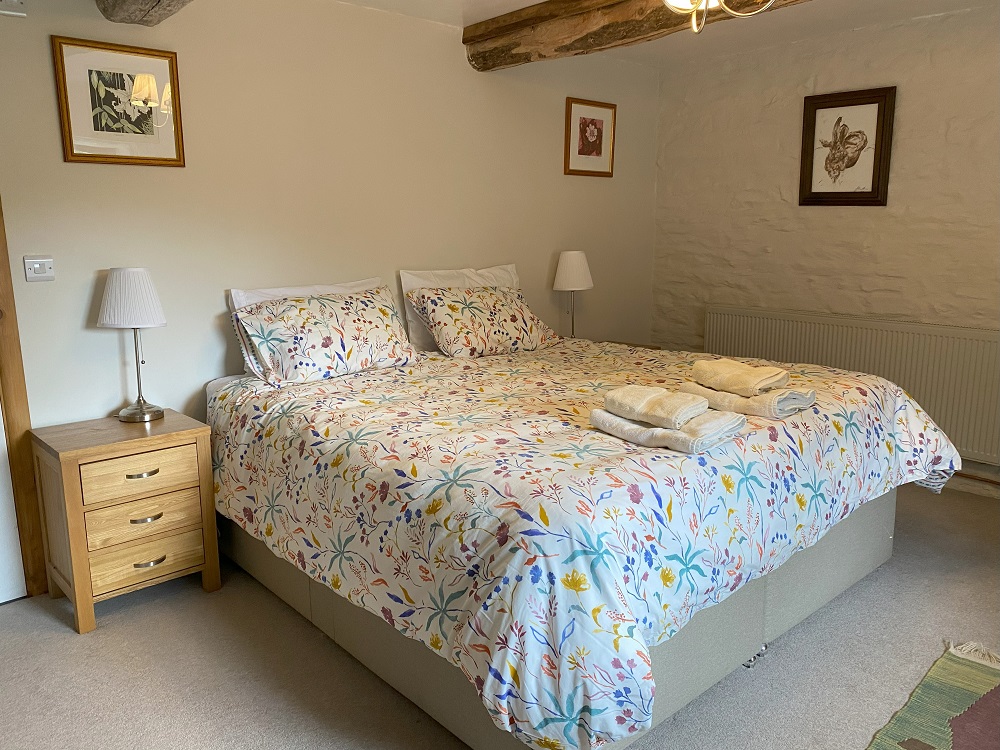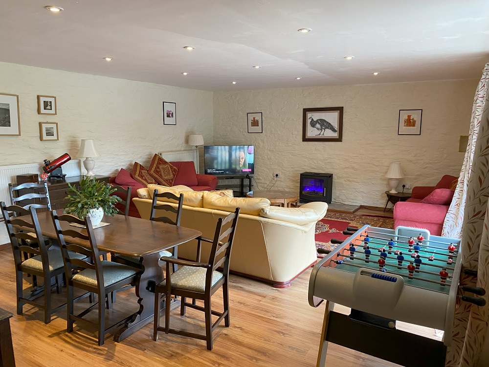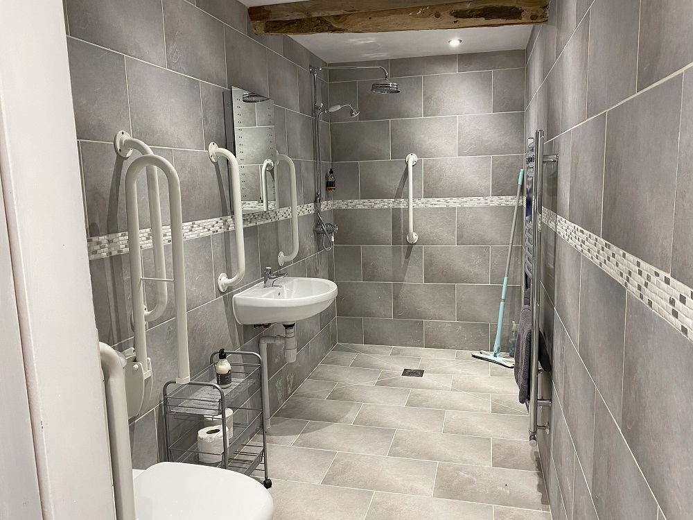 From the kitchen a door lead, down two shallow, through to a large lounge dining room, with electric Aga wood-burner, smart TV, comfy sofas, dining furniture, and antique dresser. Also in this room there is a selection of games and puzzles to suit all ages plus table football. Up a few steps to a door leading to a super king size bedroom (please let us know if you would prefer this as a twin). This room has an en-suite wet room with grab rails.