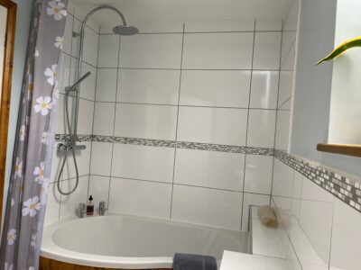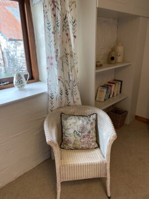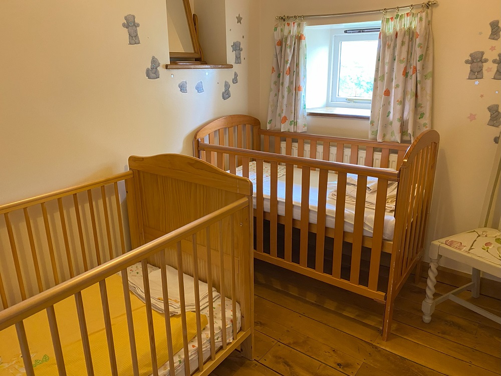 The nursery is furnished with pine cot and cot bed with attractive bedding and has a starry blackout blind and double lined curtains for those long summer days. There is a nightlight on the landing and sockets in the nursery have protective covers.