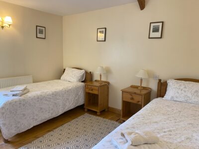 Upstairs the bedrooms (double & twin) are all furnished in Welsh pine. They have soft cotton bed linen and fluffy duvet and pillows made from recycled plastic bottles.