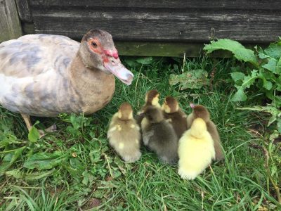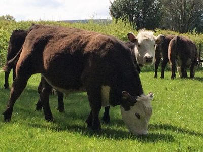 The farm is home to a herd of 10 Murray Grey suckler cows which calve in the spring. The Murray Grey is a cross between two traditional native breeds, Aberdeen Angus and Beef Shorthorn. The cross was made in the valley of the Murray River in Australia and this gives the breed its name. Some of our calves are weaned at about 8 months and sold when approximately 2 years old, others we keep and add into the herd. We have a Murray Grey bull now but recently we had a Hereford which means that some of the cows calves have white heads and range from milk to dark chocolate in colour.