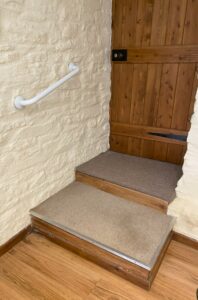• Three, wide shallow steps with hand rail, up to superking bedroom with carpeted floor.